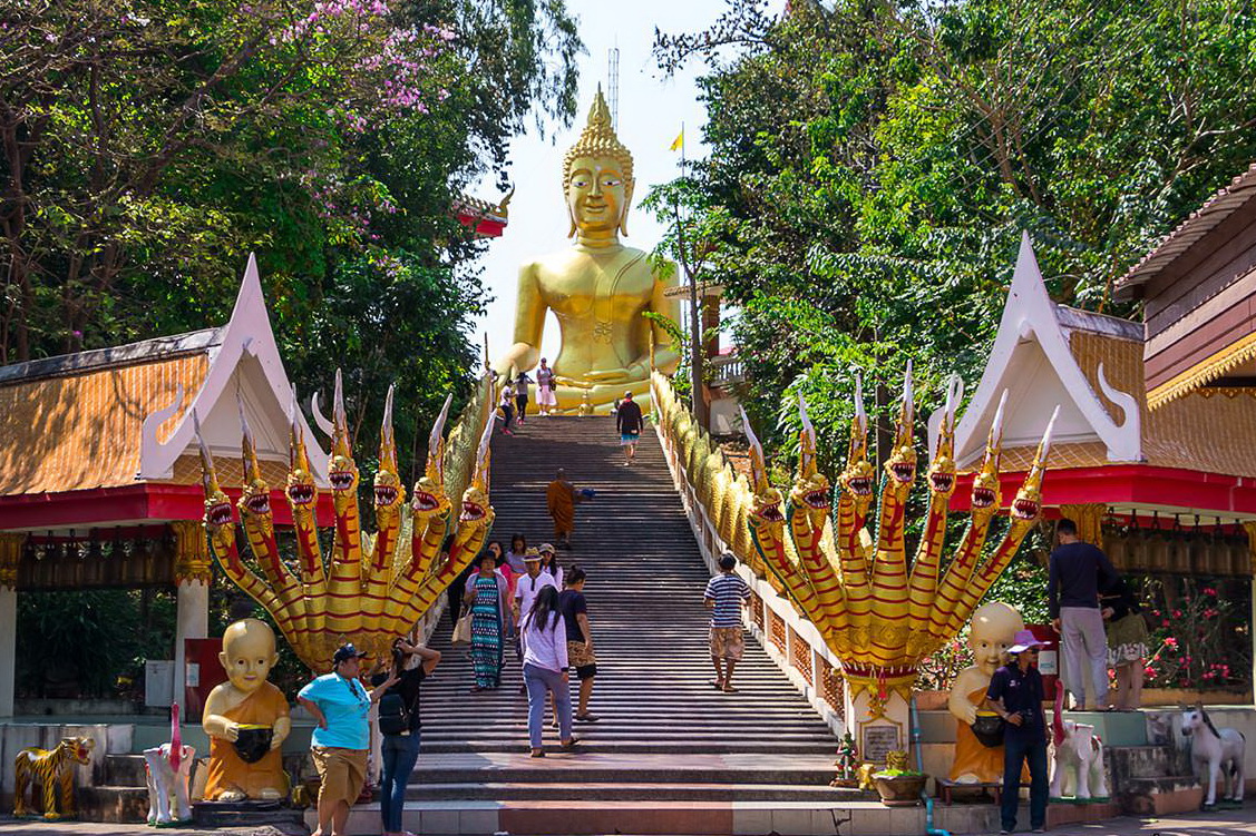 This Big Buddha – the largest in the region – is the highlight of Wat Phra Yai, a temple built in the 1940s. The Big Buddha is extremely popular with tour groups it is also revered by local people who come to pray at the temple. partial views of Jomtien Beach, and the pavilion hall which has a beautifully painted mosaic on the walls.
